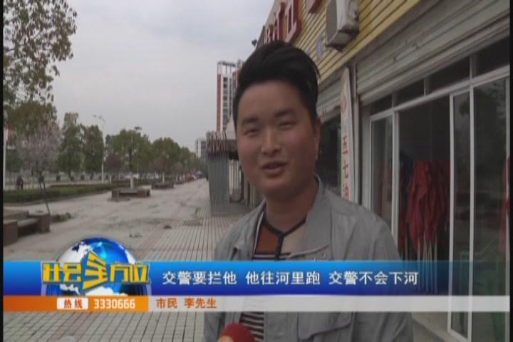 交警就说要他起来起来,说不拦你,不拦你,他还是往河中间跑,看见水淹到他头上去了,他就往回走,河中间有一些沙滩,他就坐在那去了。