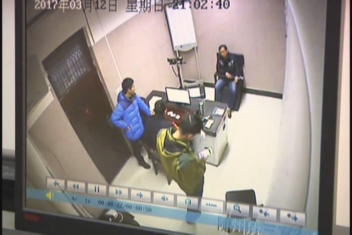 (同期声)当晚八点四十九分五十五秒的时候,第一位嫌疑人出现了,紧接着他的同伙也出现了,他们还在这个单向出口这里都留了一下。这两位都是我们的侦查员,第一位嫌疑人进去了我们没有动手,另一位嫌疑人进去了,我们的侦查员就把他推进去了,另外几名侦查员也在里面配合进行夹击抓获。