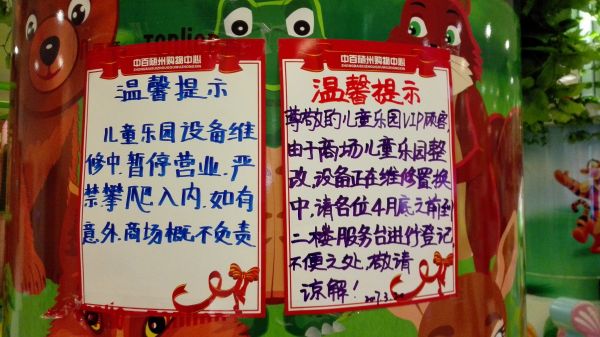 记者在现场看到张贴的告示,内容为该游乐场正在进行封闭改造,请办理了会员卡的家长于四月底前到二楼服务台进行登记。随后,记者找到了该商场的负责人,他们表示目前正在和游乐场负责人协商,会尽快妥善解决!