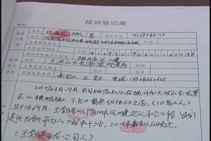 【采访】随县公安局治安大队副大队长 周清龙:经调查,王某在2009年承包一个建筑项目,2011年完工,在工程完工之后,王某仍拖欠农民工工资二十余万元,经随州市劳动监察支队限期整改,王某为了应付,支付了一小部分给当事人,还下欠十八万多块钱没有支付。