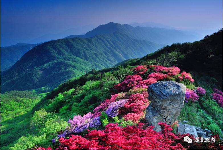天马寨位于湖北英山境内,4月是天马寨最美丽的季节,五彩杜鹃沿着最高海拔接近1100米的高度梯次盛开。盛开的杜鹃开遍整个山脉的大小山脊,让荡漾翠绿的群山披上绵延十里的“五彩丝带”,蔚为壮观。天马寨与其他景区的杜鹃群落不同,杜鹃花海虽然还是以红色为主打,但是紫色杜鹃的稀有绽放,更具特色。走进花海中,不得不被这里杜鹃的魅力所震撼,杜鹃恣意盛开,有的依附于杂乱的怪石之间,有的红紫相间,有的与一些灿烂的野花作伴,它们扎堆成片,顽强的枝干或疏斜,或丛生,棵与棵相互扶持,枝与枝彼此并肩,朵与朵挨着笑脸,绽放着各自的灿烂,像一幅神妙的山水画卷令人眼花缭乱,又似一匹匹状如簇拥奔腾的骏马。人在花间走,如在花海游。淡淡的花香涤荡着心神,让人如痴如醉。