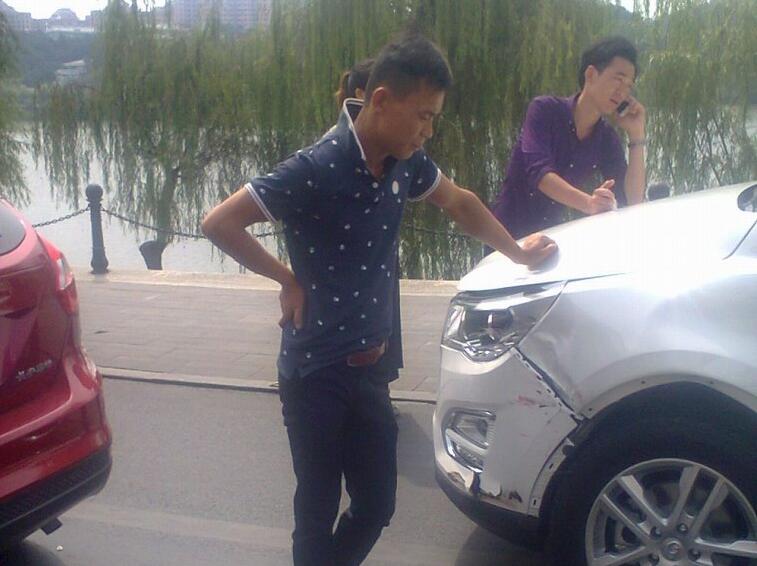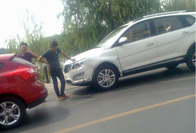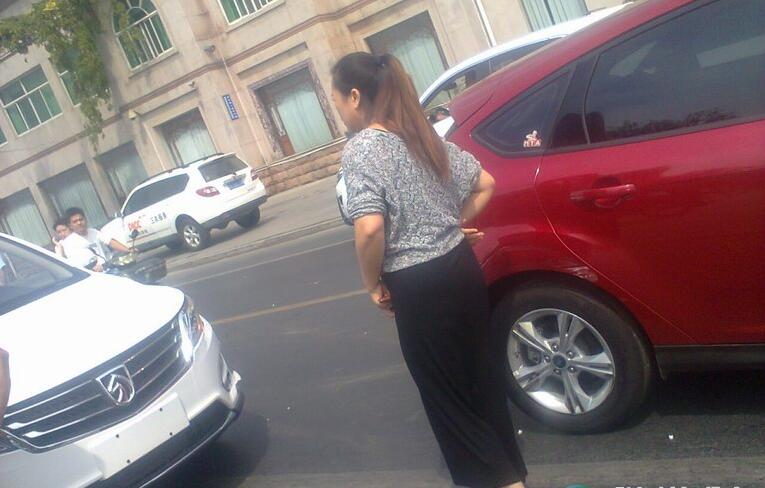 前面发生车祸,正在扯皮。女司机驾驶红色福特(也很新的车)在前,后面宝骏车撞上福特的侧翼,擦伤也较严重。