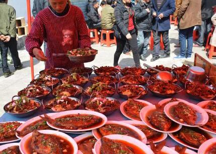 安徽省安庆市,专职上门烧饭人员带上桌椅板凳、锅碗瓢盆及米、菜等素材,翻山越岭来到村子里给群众烧午饭,8个人,从上午10点忙到下午3点,最低档次,每桌280元。