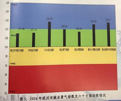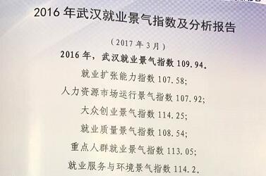 今天,武汉市人社局发布了2016年武汉就业景气指数,2016年,在开局不利和错综复杂的内外环境下,武汉市加快推进各项改革工作,积极鼓励创新创业,保持了经济的平稳和就业稳定。相比于2015年,2016年就业景气指数从111.85下降至109.94,虽有所减弱,但仍旧处于稳定区,接近扩张区。