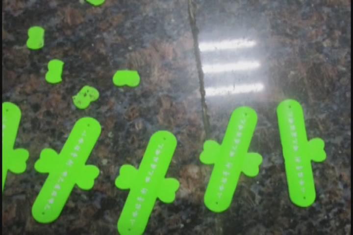 当晚9时许,执勤民警通过监控发现一辆湘A牌照的蓝色雪铁龙轿车超速行驶,而且该车的车牌被数条绿色的东西遮住了。起初民警观察照片以为是胶带纸,直到查获该车后才发现,遮挡号牌的是好几个便携式手机支架,上面还印有“哪儿痛贴哪儿”的字样。