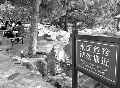此外,在公园入口处有一片池塘,池塘旁的指示牌上写着“水面危险,请勿靠近”,其翻译为“Risk of water surface Please Keep away”。贝斯看过该指示牌的英文翻译后表示,她认为园方提醒的是“地面有积水因此很滑,存在风险”。她表示,如果是要提醒避免落水,英国人可能会选择用英文警示游客“此处水深危险”。