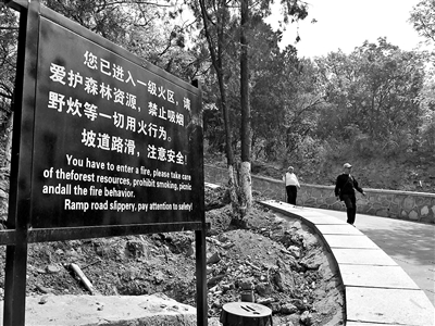 对此,园内的工作人员告诉北青报记者,出现问题的几块标语牌是今年过年之前刚刚设置的,“因为八大处是防火区,以前有些游客会在园内抽烟,为避免引发火灾,公园在主要道路旁边设置了很多提示牌。另有一些标语牌是为了提醒游客注意安全设置的。”