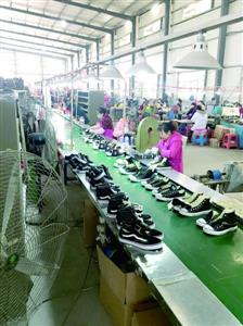 生产车间面积上千平方米,里面气味刺鼻,数台电风扇正呼呼转动,100多名工人十分忙碌:制作鞋底、印花、缝制鞋面、做鞋帮、固定鞋型、系鞋带、装盒……