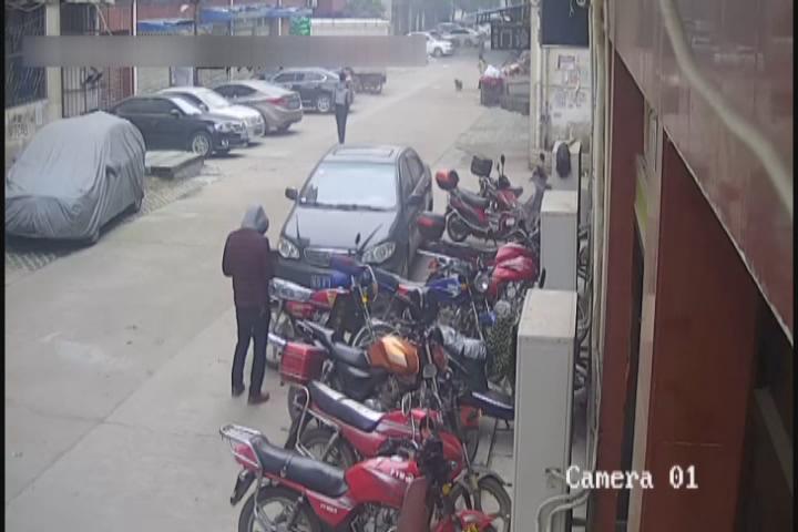 民警调取何店镇小监控发现,当天上午11点33分,两个戴着连衣帽的年轻人骑同一辆摩托车驶入了学校。3分钟后,两人从学校出来,但此时已经变成一人骑着一辆车,很明显另一辆摩托车就是被盗的那辆。民警沿途调取监控,掌握了丢失摩托车的行动轨迹,并在盗窃者停放摩托车的位置发现了其他有被盗嫌疑的车辆。