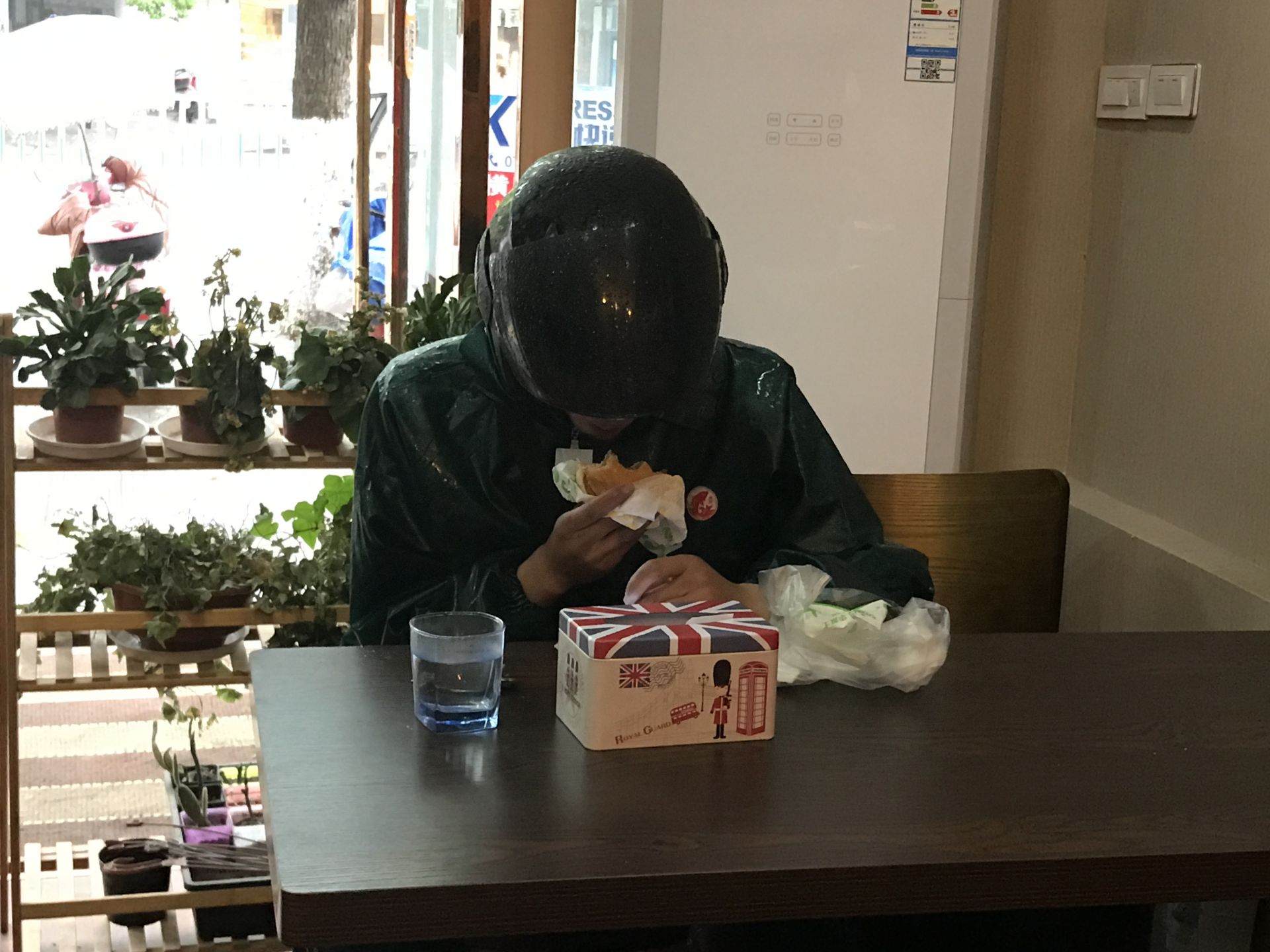 (快递小哥来不及吃午饭,等餐间隙吃个面包,跑了一天才喝上一口热茶)