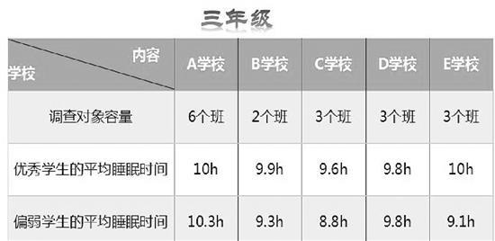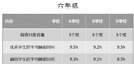 这个调查靠谱吗?睡眠时间的长短,真的会对孩子的学习成绩产生影响吗?昨天,钱报记者随机找了杭州5所小学,做了抽样调查(如右图)。从调查结果看,成绩优秀的学生的平均睡眠时间,确实要比偏弱的学生略长。