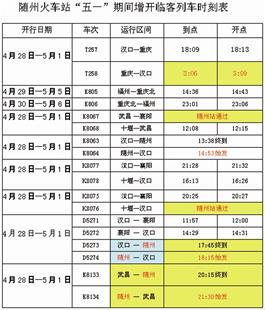 4月28日至5月1日,重庆至汉口增开T258次列车,十堰到武昌增开K8068次列车,汉口至襄阳间增开D5271/2次列车以及K8077次、K8075次列车,十堰至汉口增开K8078次列车,均经停随州站。