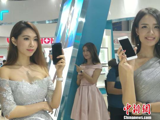资料图:“2016年天翼智能终端交易博览会”上模特在展示智能手机。唐贵江摄