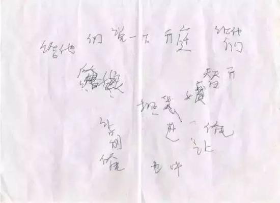 写给干警孔令壮的纸条徐丽芹拿着手里的另一张纸条与站在旁边的陈錾(曹县检察院公诉科科长)一块辨认,“给他们说一下,让他们替我开庭。”陈錾说,“这是写给我的,说让我安排好王勇办理案件的出庭事宜。”徐丽芹辨认着纸条上的内容,说:“这是写给我的,写的是‘给俺娘说,别担心’。”