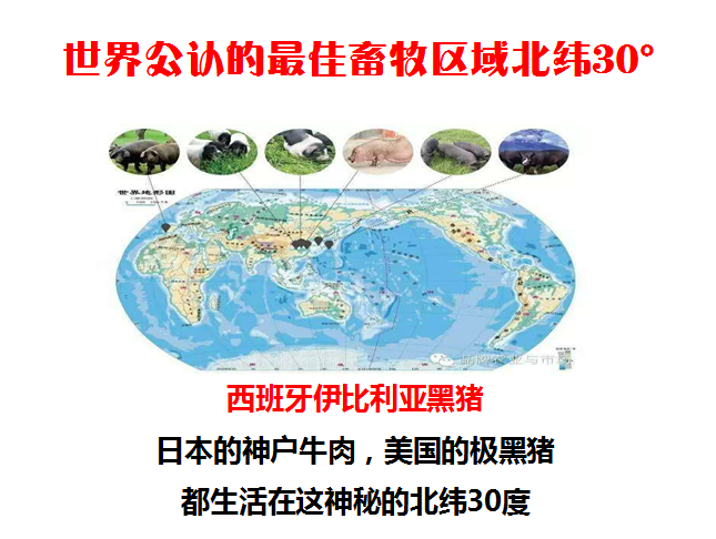 西班牙伊比利亚黑猪生活在神秘的北纬30°——世界公认的最佳畜牧区域,日本的神户牛肉、美国的极黑猪都生活在这个区域。