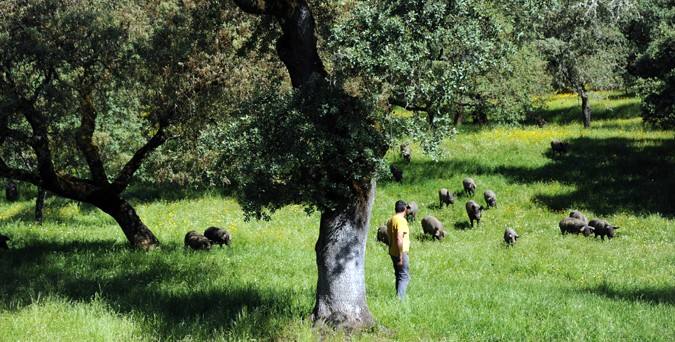 西班牙本土特有的猪种,也是最接近野猪品种的利比里亚黑皮猪,位于伊比利亚半岛西南部的天然山区生态系统,那里的野生天然橡果是伊比利亚猪群的主要食物,纯生态的喂养,还让它们的蛋白质比普通猪群高。