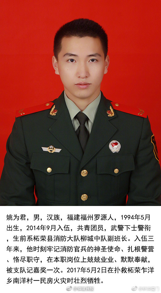 5月2日上午,福建宁德柘荣县发生一起民房大火,1人被困。搜救过程中,民房中部墙体突然发生倒塌,消防员姚为君同志被埋压。经过官兵全力搜救,姚为君于5时04分被救出,并立即送往医院,不幸的是,经全力抢救无效,姚为君同志于2017年5月2日7时11分壮烈牺牲。