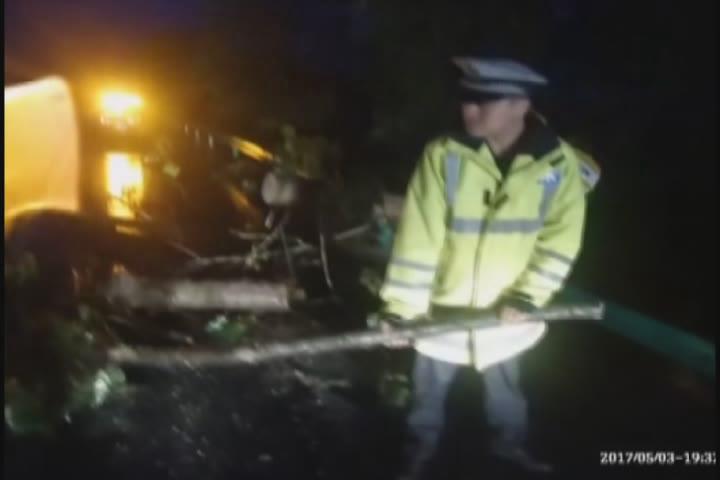 当时辖区正普降暴雨,能见度低,路面湿滑,过路车辆稍不注意,极易引发交通事故。为确保过往车辆安全通过此路段,民警迅速对路面划设警戒区域,并打开警笛在现场后方300米处提醒过往司机减速慢行,同时请求路政及养护部门迅速赶到现场进行支援;做好现场的安全警戒工作之后,两名民警迅速将现场零散的树枝清理到护栏外,并合力将超车道的树干处理,确保路面超车道通行畅通。