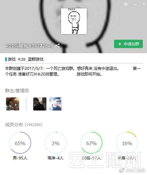 《蓝鲸死亡游戏》(Blue Whale)是发源于俄罗斯的一种自杀式死亡游戏,游戏鼓励玩家在50天内完成各种残忍伤害自己的任务。很多青少年受其蛊惑结束了自己的生命!有网友举报称这种邪教游戏已经流入中国,于“蓝鲸”挑战的任务之一是每天4:20起床,我国内地也出现了类似于 “4:20叫醒我” 的代号社交群。请各位家长警惕孩子手机里类似“蓝鲸”、 “4:20叫醒我” 等字眼的社交群,无论是不是开玩笑,都请警惕!