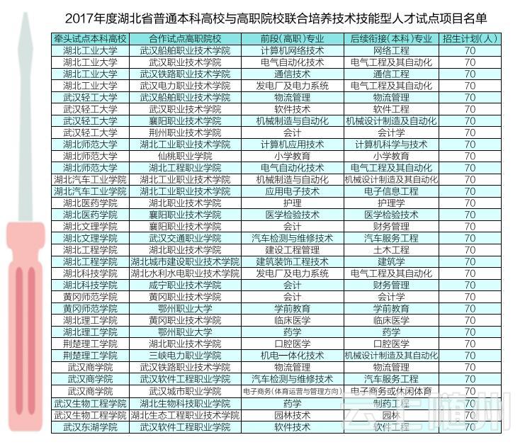 记者昨日了解到,经省教育厅审核,今年试点高校为湖北工业大学等14所普通本科高校和武汉船舶职业技术学院等21所高职院校,联合招生计划为2310人。