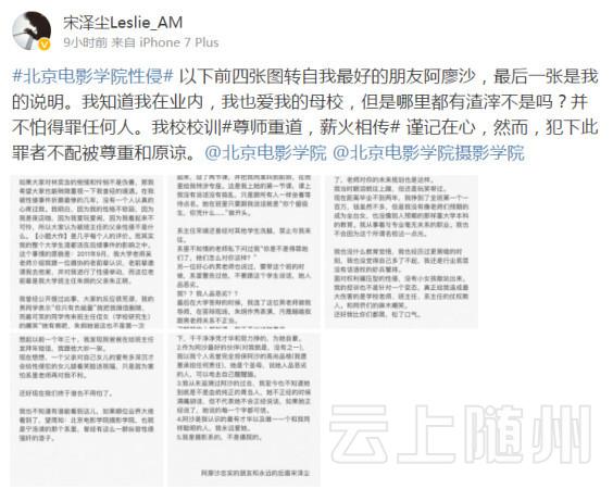 今天凌晨两点58分,微博实名认证为“畅毅文化艺人事业部总经理”的@宋泽尘Leslie_AM发表微博,称好友“阿廖沙”在北京电影学院就读期间,遭遇班主任之父性侵。事后阿廖沙更遭遇来自老师和同学的排挤和歧视。不少网友纷纷涌向北京电影学院官博讨要说法。截至目前,事实真相尚有待核实,而院方也未就此事发表声明。