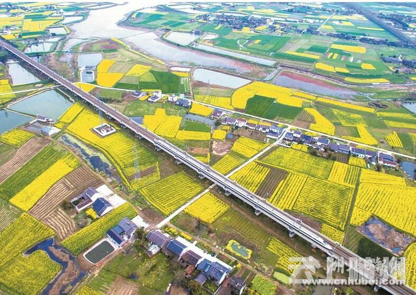 图为:动车组列车驶过江汉平原,窗外是一幅幅田园画卷