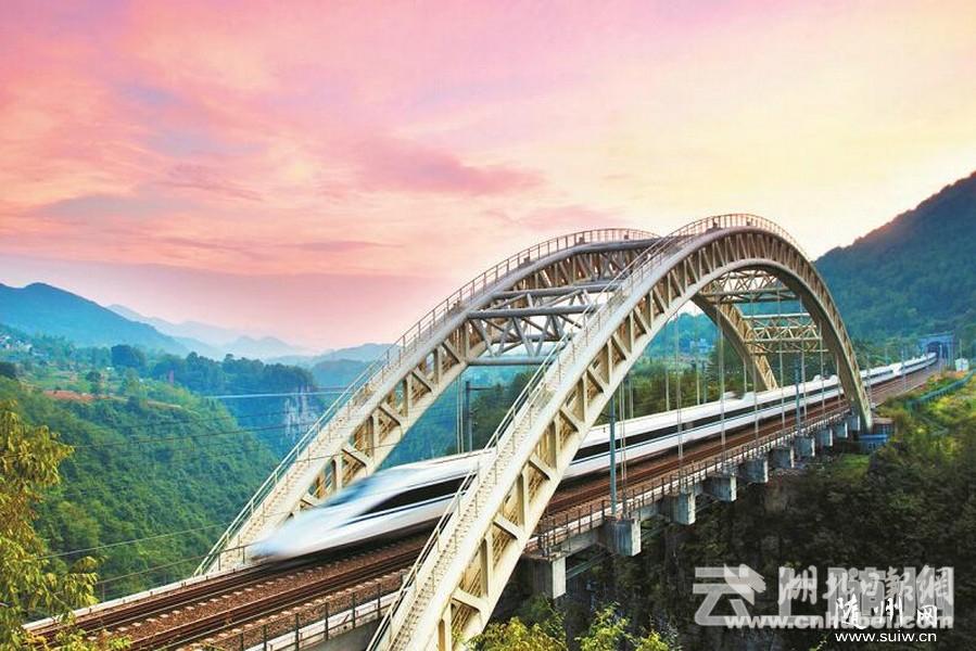 图为:宜万铁路野三河大桥段,缤纷的晚霞是动车的衣裳