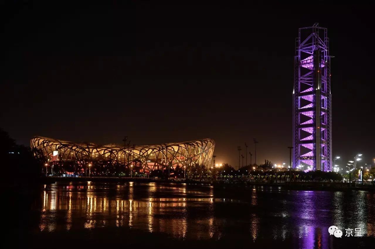 奥林匹克公园的鸟巢和玲珑塔在水一方,艳丽妖娆。