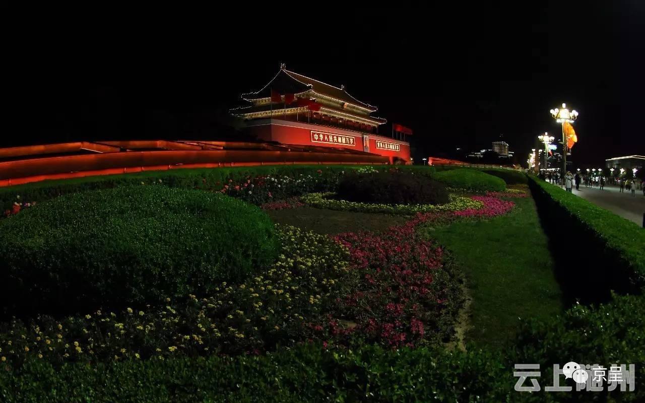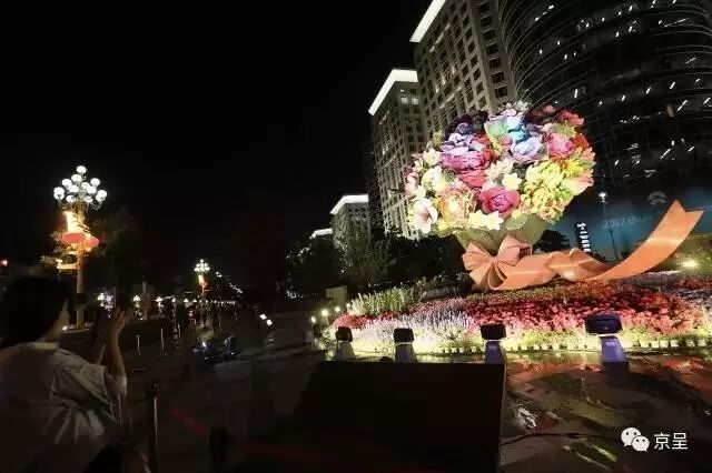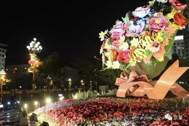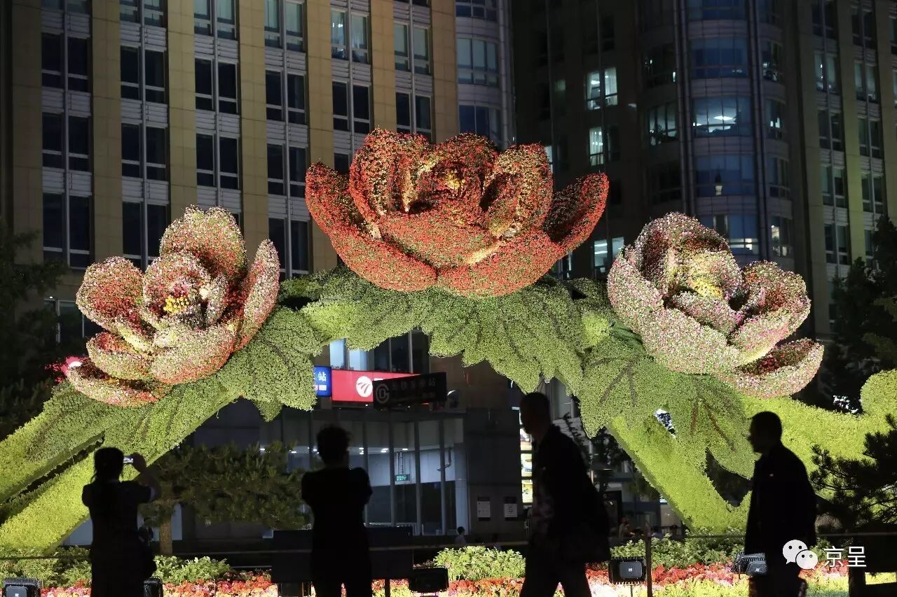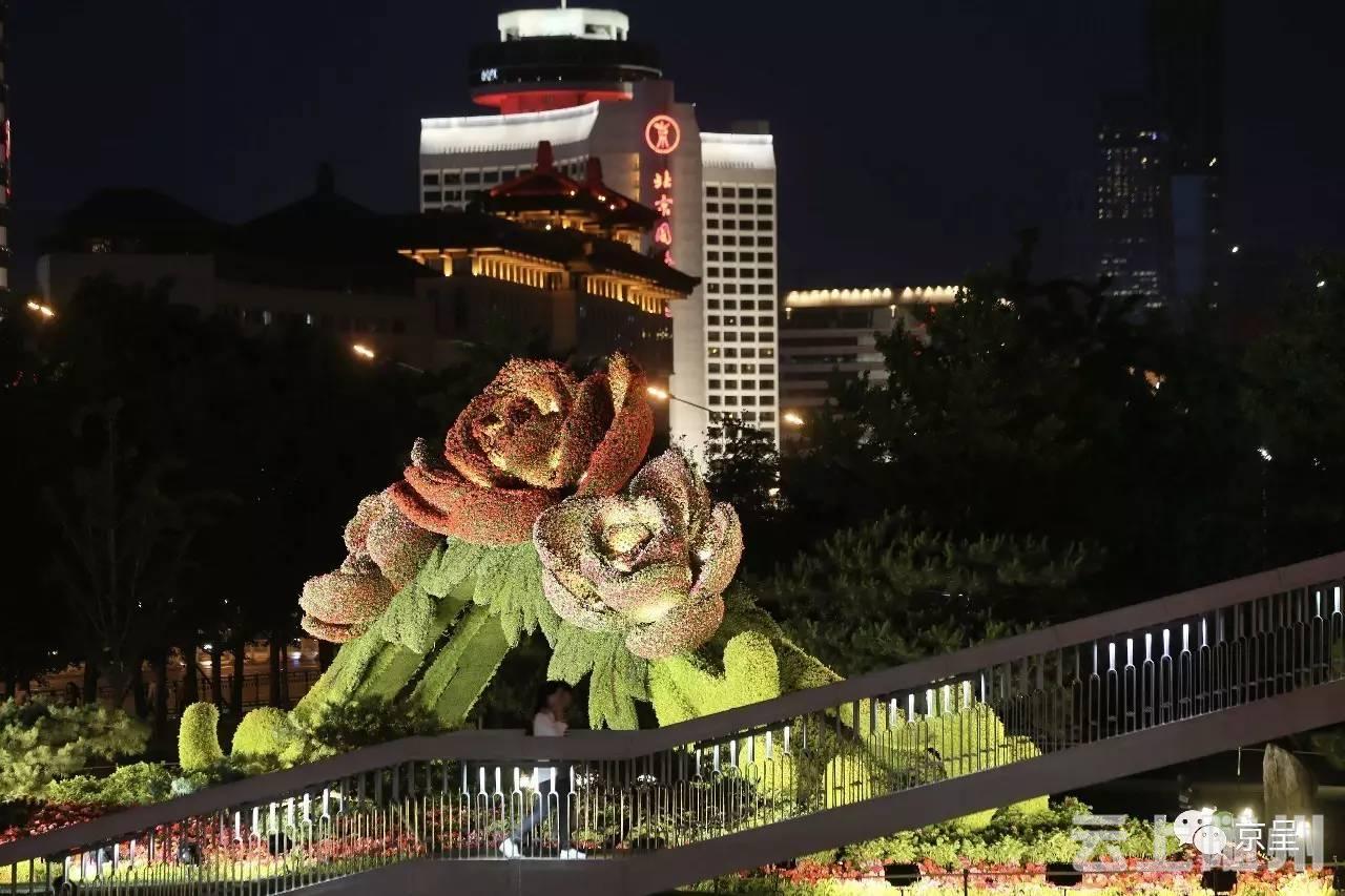雍容华贵的花坛与灯火辉煌的长安街沿线建筑共同点亮北京之夜。