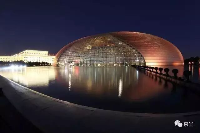 国家大剧院在外部景观灯和激光的照射下,变换着各种不同的色彩。