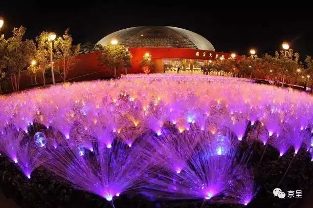 大剧院前,近2300平米的草地上布满各种小喷泉造型的光纤灯管,风中摇摆,如同花海。