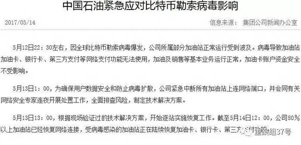 ▲中国石油发布消息称紧急应对比特币勒索病毒影响。 中国石油官网截图