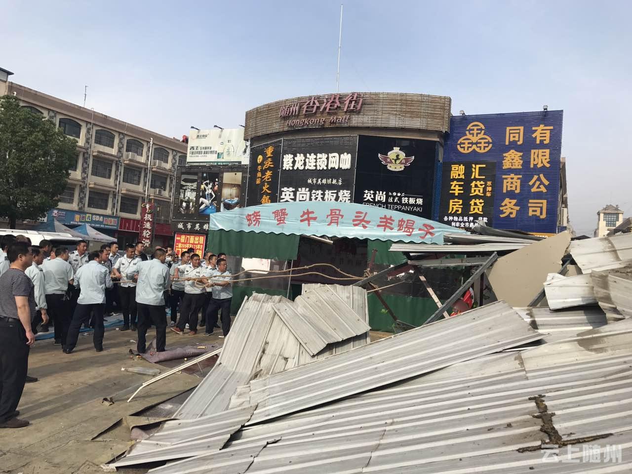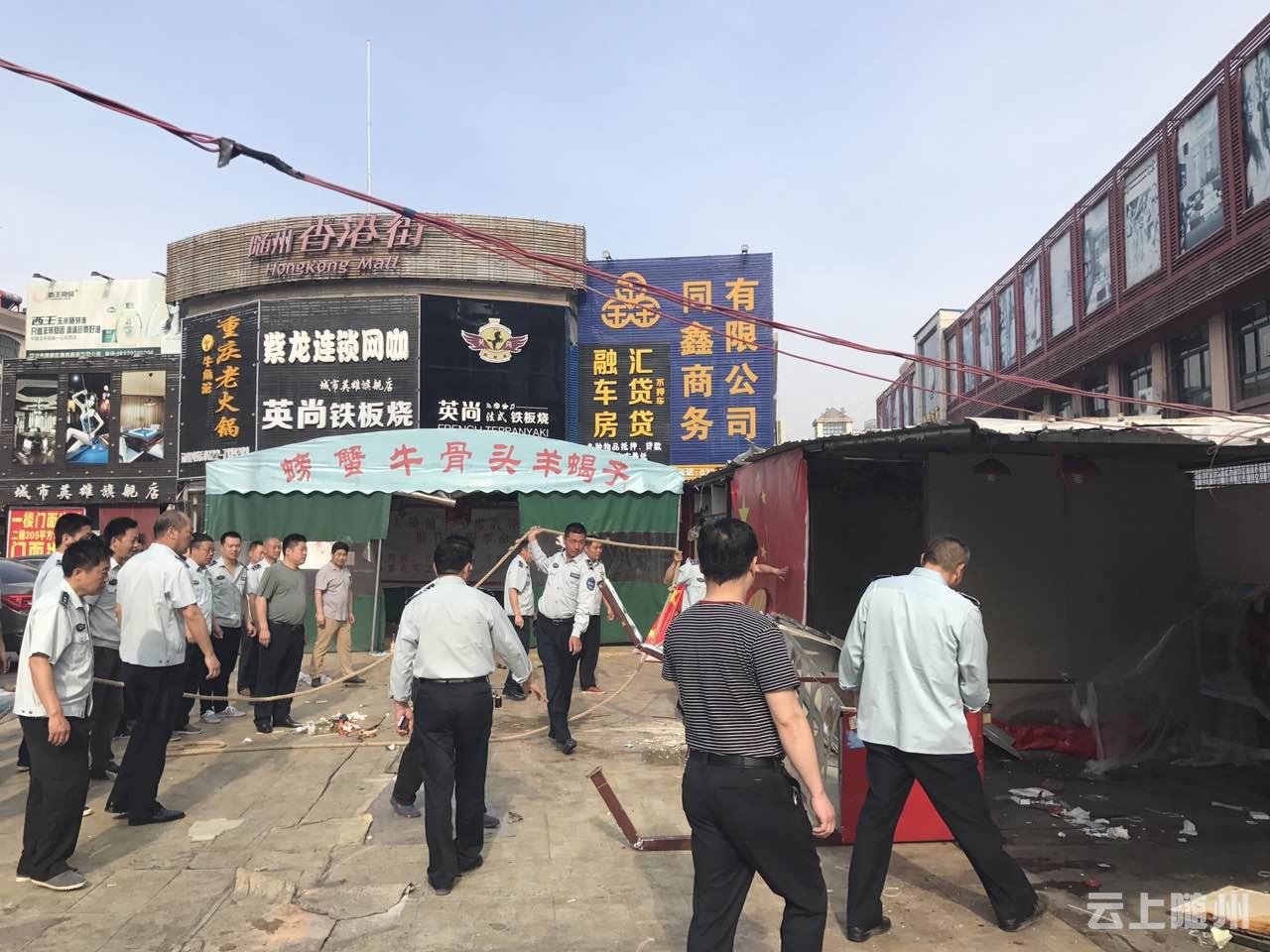今天上午,城管部门重拳出击整治香港街夜市烧烤排挡,拆除违章搭建。