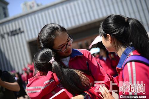 资料图:内蒙古高中生毕业典礼 同学拥抱惜别。中新社记者 刘文华 摄