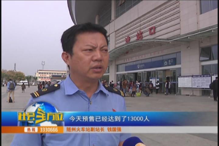 (采访:随州火车站副站长 钱国强)1号2号可能是受天气影响,下雨加上降温,出行人数比预期减少了将近两千人,后期由于天气变好,逐步客流回升起来了,而且从昨天前天这两天数据来看,都超过了去年。今天预售已经达到了13000人,预计14000到15000没问题。