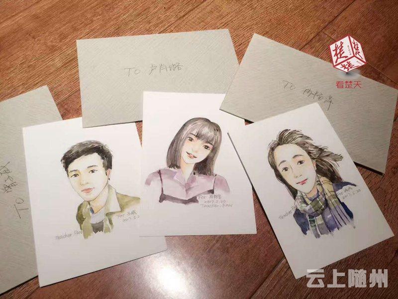 近日,该班学生顺利结束毕业答辩,范晶晶给班上每位同学送出了由自己亲手绘制的水彩明信片,明信片正面是她为每个学生手绘的人物肖像,反面则是她亲手写上的昵称和对学生的祝福。