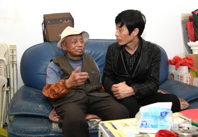 百步亭文卉苑社区副主任方伟(右)到社区独居老人庞云鹏家探望(4月17日摄)。新华社记者 程敏 摄