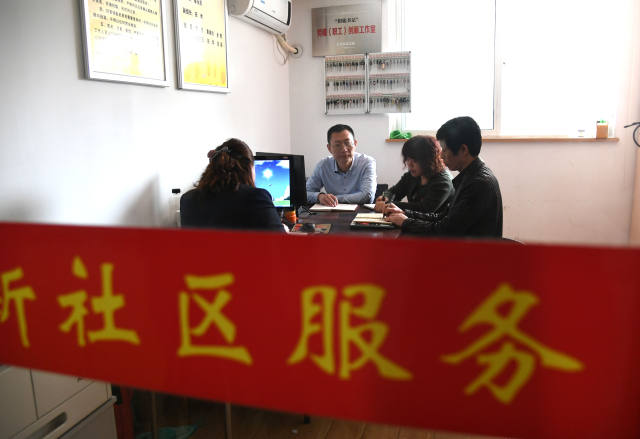百步亭文卉苑社区“钥匙书记”办公室的工作人员在商讨居民服务事宜(4月17日摄)。 新华社记者 程敏 摄