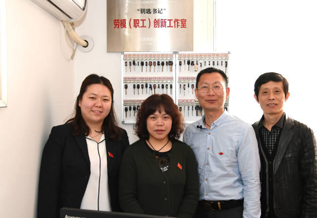百步亭文卉苑社区“钥匙书记”秦永庆(右二)和同事们在钥匙保管室(4月17日摄)。新华社记者 程敏 摄
