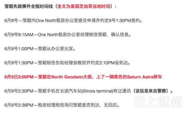 芝加哥时间6月9日14时左右,章莹颖在古德温大道与一辆黑色土星汽车(Saturn Astra)司机进行了一段27秒的谈话后,坐上了副驾驶座位。该车辆向北行驶,此后,章莹颖便失联了。