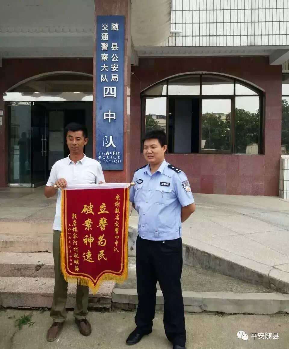 6月13日上午,随县殷店镇的张某来到随县公安局交警大队四中队,将一面绣有“破案神速,立警为民”的锦旗双手递到民警邱欢的手中,诚恳而又憨厚地说:“这面锦旗代表我们全家的谢意,是你们为我们讨回了公道!”