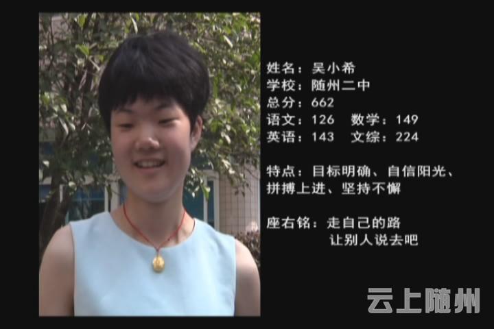 作为第一个夺得全省第一名的考生,肖雨是随州人的骄傲。而随着今年高考分数的公布,我市文科第一名也新鲜出炉。巧的是,文科第一的吴小希和肖雨同校,都是来自随州二中,她在高考中以662的高分取得了我市第一名、全省第五名的好成绩。