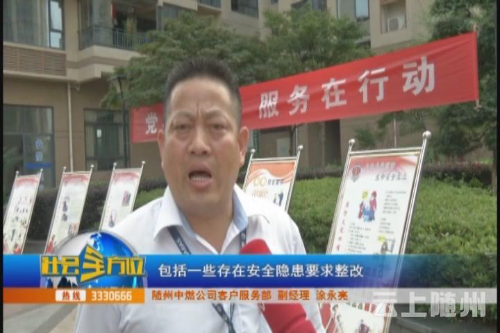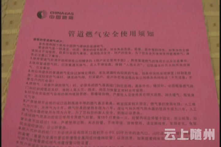 【采访】随州中燃公司客户服务部 副经理 涂永亮 这个安全检查每年进行一次,对所有的燃气用户对进行一年一次的安全检查,入户以后首先对他们的安全设施,包括用气的习惯进行提醒和纠正,包括一些存在安全隐患要求整改,保证燃气用户的用气安全。