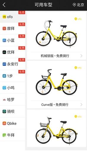 在“全能车”APP系统界面中,有12种单车类型可选。ofo、摩拜、小蓝、优拜、酷骑、永安行6种共享单车,在北京地区均可“免费骑行”,其他单车显示“北京地区暂未投放”。