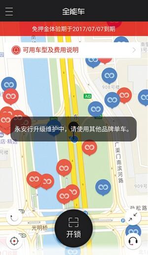 不过在昨晚10点半,新京报记者使用全能车扫码多辆永安行、优拜单车,均无法解锁,其中永安行开锁页面显示“永安行升级维护中,请使用其他品牌单车”。