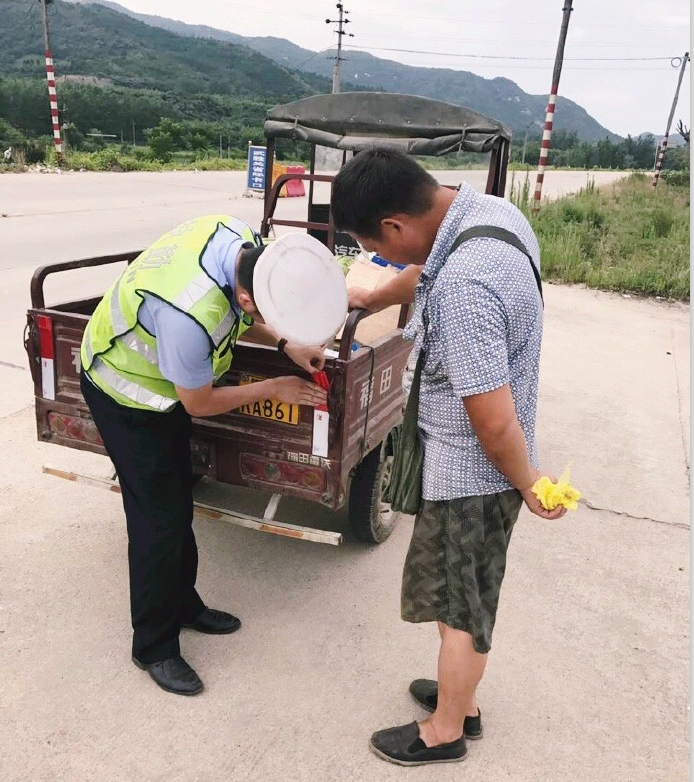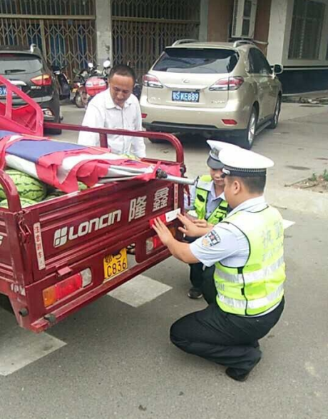 农用车主黄某说:“我每天凌晨批发蔬菜,路上总是提心吊胆,交警给我车尾和两侧都贴上了反光条,以后夜间行车安全就有了保障!” ( ps车主:以前看见交警躲着走,现在看见交警笑咪咪!)