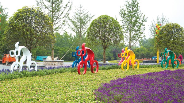白云湖健康主题公园(回龙寺公园二期)凸显休闲健身主题,为广大市民提供又一个休闲健身、游乐观景的好去处。图为花瓣广场的一组骑行雕塑。