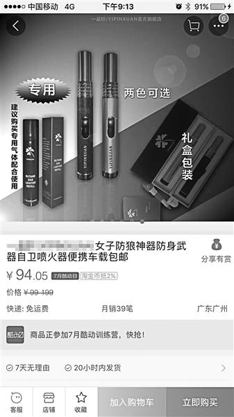 进入夏季以来,性骚扰、地铁“咸猪手”等引发社会关注。近日,北京青年报记者发现,一种名为“防狼喷火器”的器械在淘宝上十分畅销,卖家在宣传中称“轻者烫伤,重者毁容”。对此,有民警表示,这种“防狼神器”并不合规。