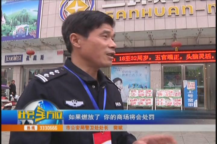 (市公安局警卫处处长 樊斌、商场负责人)如果燃放了,你的商场将会处罚,处罚不听劝阻的,罚款会比较重,妨害执行公务的,要依法治安拘留。希望你们配合。商场负责人:这个没有问题,一定配合。