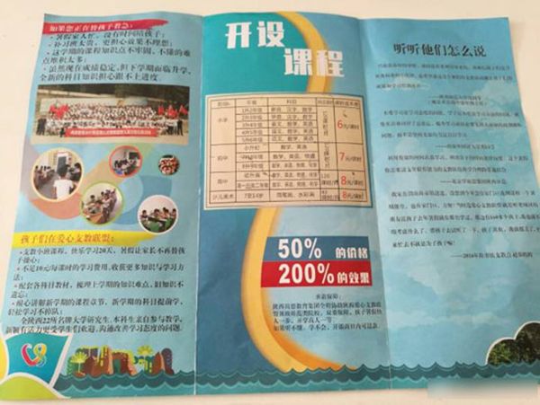 7月5日,刚结束期末考试,按照“陕西爱心支教联盟”的安排,张娜和同伴来到了汉中市南郑县红庙镇的爱心支教点。“陕西爱心支教联盟”要求7月15日正式开课,开课前首先要做招生工作。张娜和同伴一起来到红庙镇小学门口,发放宣传单,向学生和家长介绍将要开展的爱心支教活动。在这个过程中,她发现,“陕西爱心支教联盟”提供的宣传单上承诺“所有课程全部免费,只收取一定的课时成本费用,开课之后不再收取任何费用”,同时还明确,为保证教学质量,每个班限招20人,招满为止。张娜发现,每个报名的学生要交6元/课时的课时费。